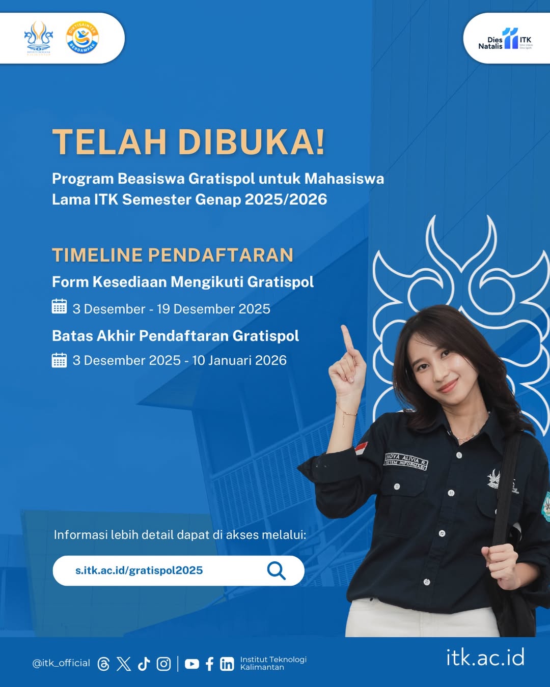 For current ITK students in the 2025/2026 even semester, don't miss out on the Gratispol Scholarship Program to support your studies.