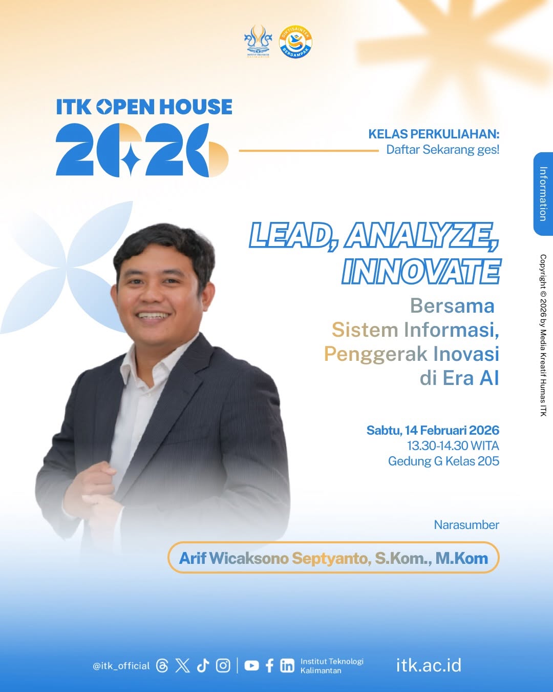 ITK Open House akan dilaksanakan tanggal 14 - 15 Februari 2026 di Institut Teknologi Kalimantan.
